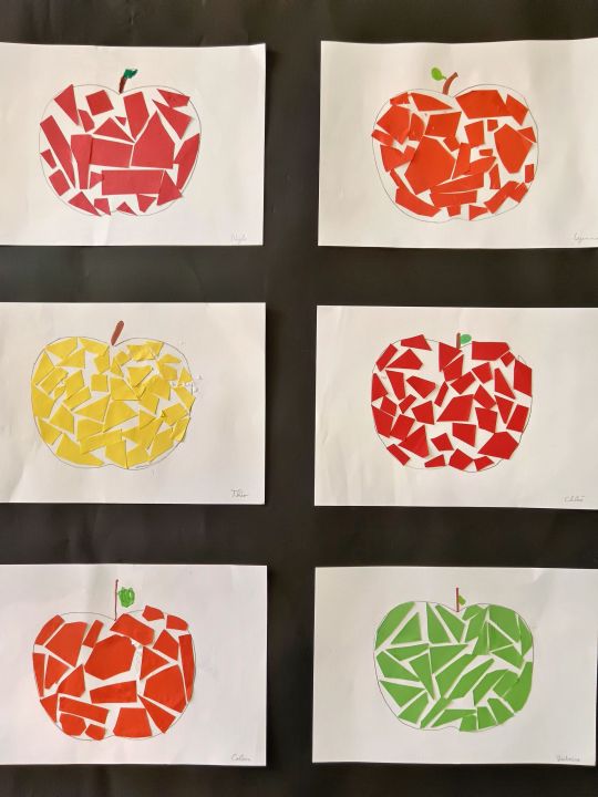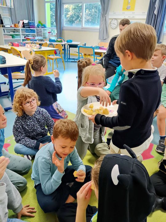 Deux élèves de l'école ont apporté du jus réalisé avec les pommes de leur jardin pour le faire goûter à leurs camarades. La dégustation s'est poursuivie en CP, pendant la semaine du goût, avec des morceaux de 4 pommes différentes : golden, granny, reinette et pink lady. Les pommes jaunes et vertes ont été les préférées des enfants. Divers apprentissages sur le thème de la pomme ont été menés en parallèle : en poésie, arts visuels et questionner le monde.